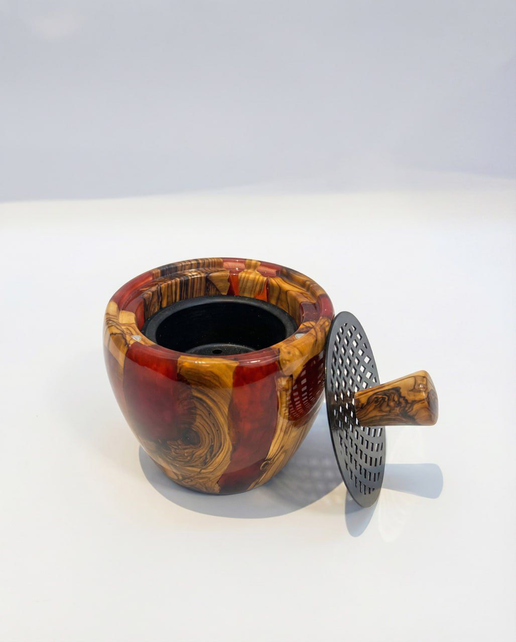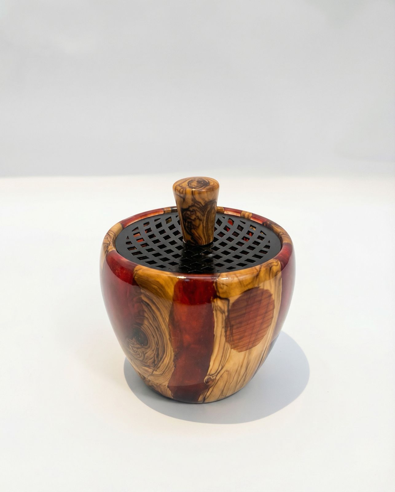 مبخرة مصنوع من خشب الزيتون الطبيعي مع الإيبوكسي مع غطاء مغناطيسي، تتميز بعروق خشبية فريدة ولمسة عصرية أنيقة بجودة عالية.